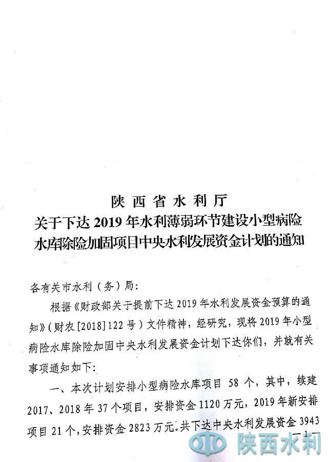 关于下达2019年水利薄弱环节建设小型病险水库除险加固项目中央水利发展资金计划的通知
